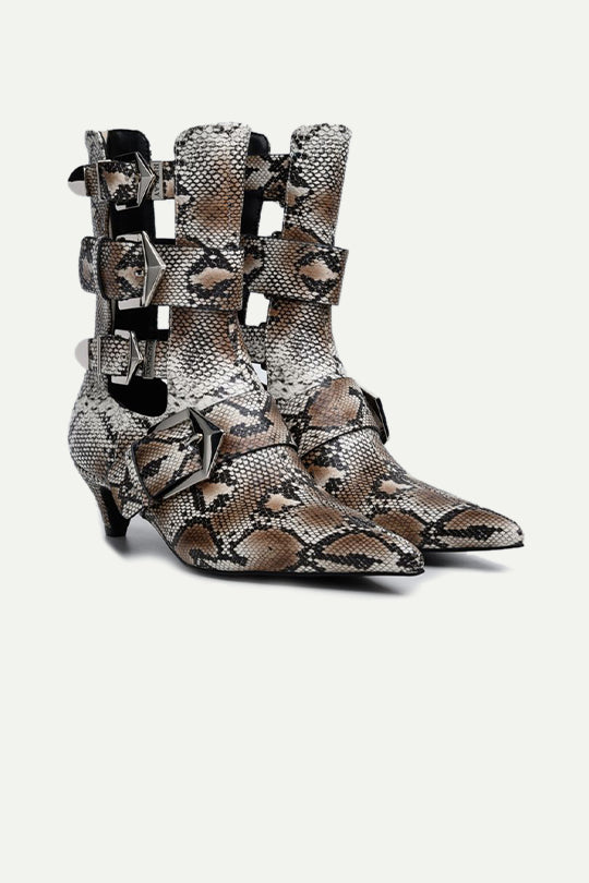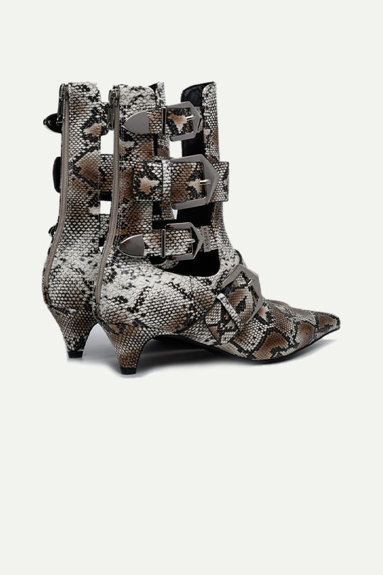 מגפוני עקב בגזרה מחודדת בהדפס נחש עדכני עם שלושה אבזמים בולטים בגוון מטאלי. העיצוב משלב נועזות עם אלגנטיות ומעניק לכל הופעה מראה מלא ביטחון וסטייל. עקב נמוך ונוח מאפשר ללבוש אותם מהבוקר עד הערב בלי לוותר על נוחות.
