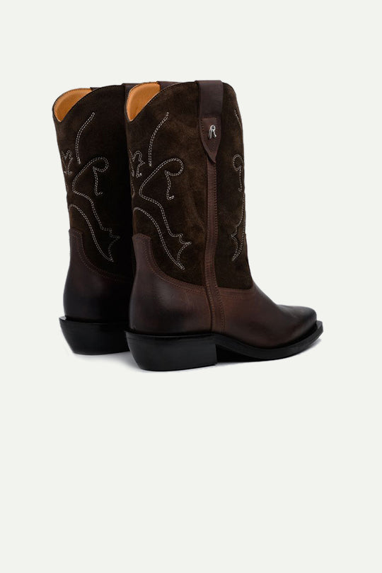 מגפי קאובוי בגובה בינוני בעיצוב קלאסי עם שילוב עור חלק וסוויד למראה עשיר ומעודן.