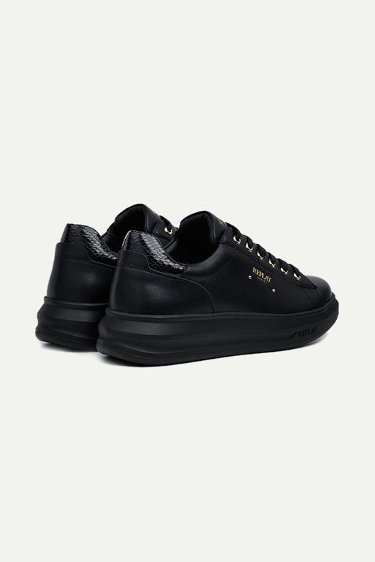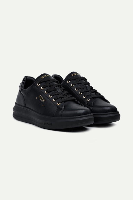 סניקרס לנשים בעיצוב עירוני נקי מדמוי עור שחור, עם ניטים/כיתוב בגוון מוזהב למראה אלגנטי. סוליה מרופדת וקלה לנוחות יומיומית, בטנה רכה ושרוכים תואמים. מושלמות לשילוב עם ג׳ינס, שמלה או וסט לאאוטפיט קז׳ואלי-שיק.