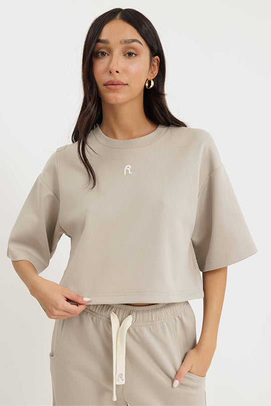 טי-שירט שחורה לנשים בגזרת בוקסי קצרה, עשויה מבד אינטרלוק איכותי, רך ונעים למגע. כוללת שרוולים קצרים, מפתח עגול בצוואר ולוגו קטן במרכז החזה. מושלמת לשילוב עם טייץ, ג’ינס או מכנסי טרנינג ללוק יומיומי שיקי ונוח.