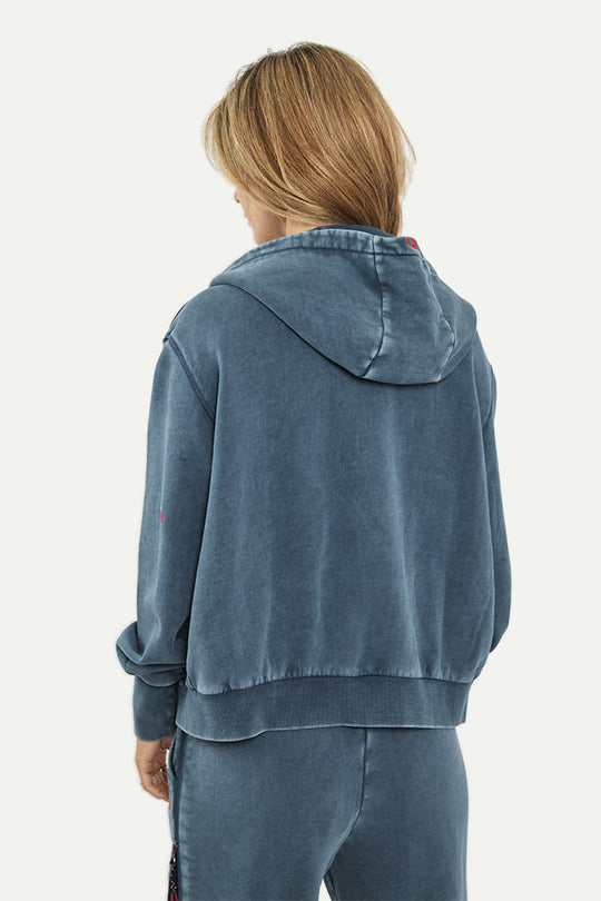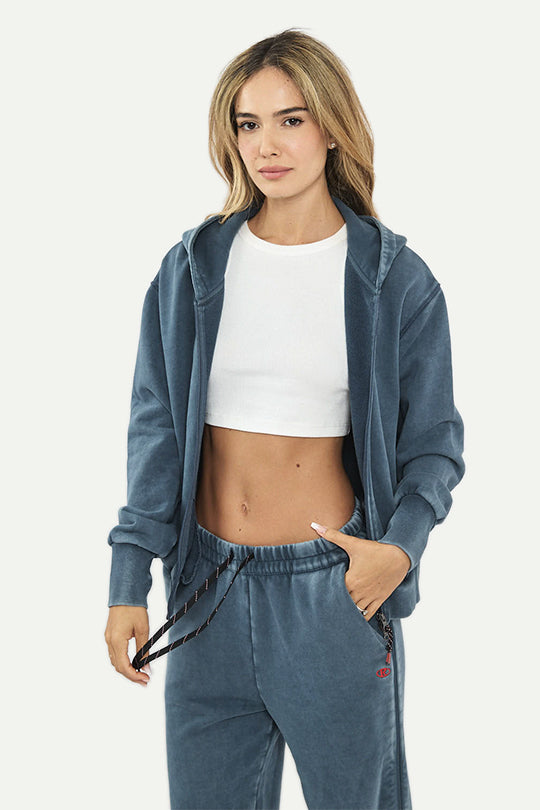 קפוצ’ון רוכסן בגזרה משוחררת ונעימה. מגיע בצבע אינדיגו עם בד טרי רך, כיסי צד ולוגו קטן על השרוול. סיומות ריב מחזיקות את הגזרה. מתאים לשילוב יומיומי או כסט עם מכנס תואם ללוק נינוח ומדויק.