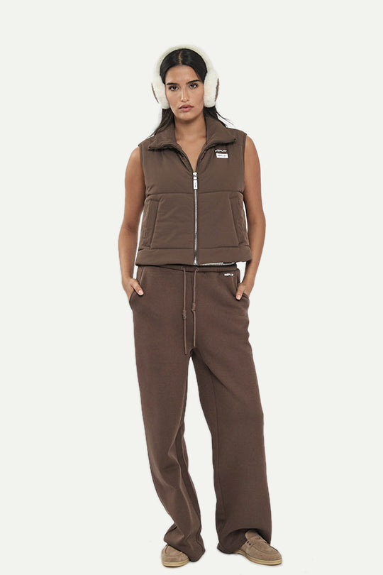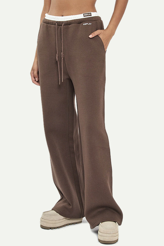 מכנסי טרנינג בגזרה רחבה ונינוחה עם גומי ושרוך במותן לנוחות מושלמת. מגיעים בצבע חום עם כיסי צד ולוגו קטן בחגורה. בד רך עם נפילה יפה שמתאים ליומיום ולסט קז’ואל מלא סטייל.