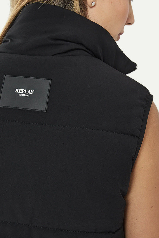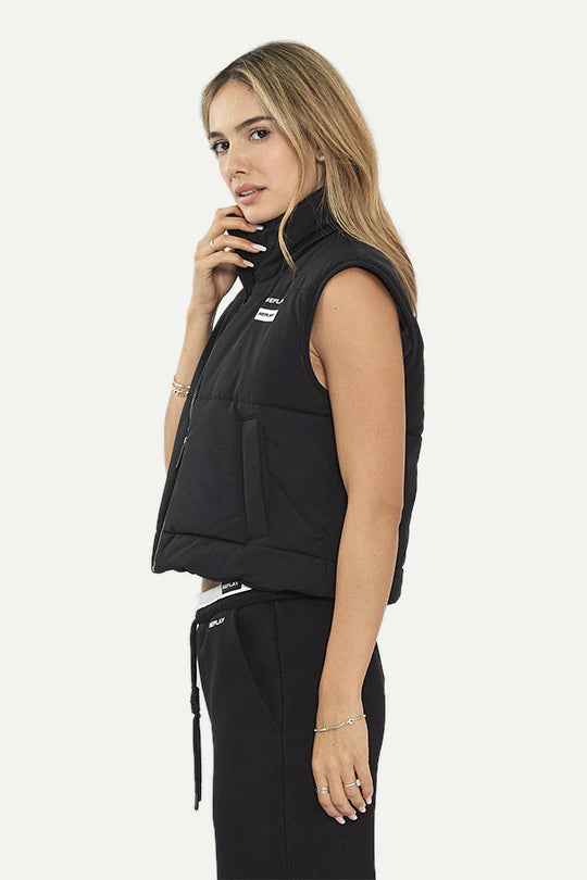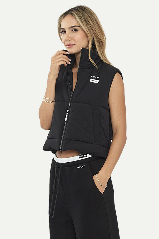 וסט מרופד לנשים עם צווארון גבוה וסגירת רוכסן מלאה לנוחות וחימום קל. עשוי בד ניילון עמיד, כולל שני כיסים קדמיים ולוגו קטן בחזה למראה ממותג ועדכני. שחור קלאסי שמשתלב בקלות מעל טי-שירט, סווטשירט או קפוצ׳ון ללוק שכבות חורפי ונוח.