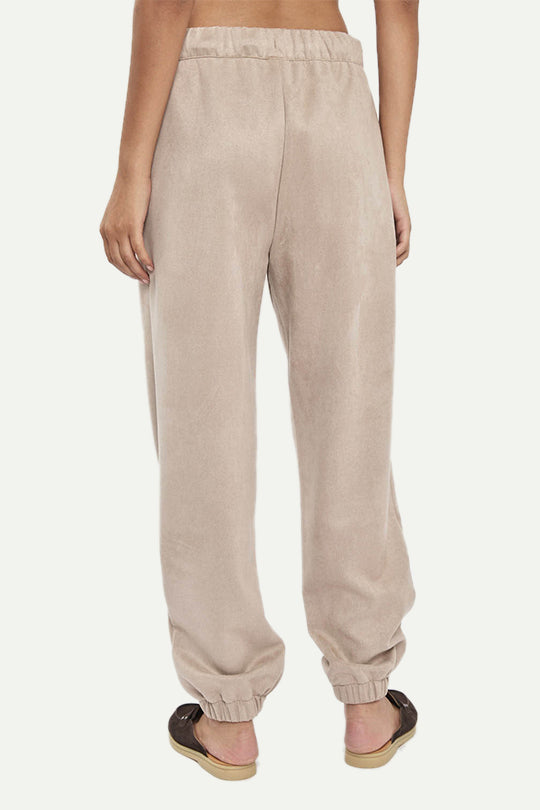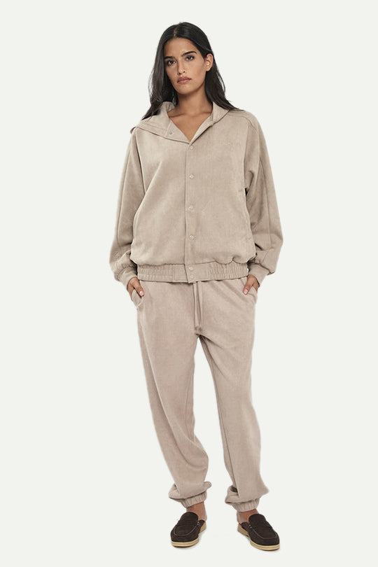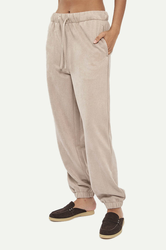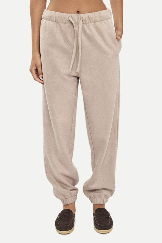 מכנסי טרנינג לנשים מבד דמוי זמש רך ונעים. גזרה נינוחה עם מותן אלסטית ושרוך התאמה, כיסים צדדיים וסיומות גומי בקרסול לנוחות ומראה מחודד. צבע קליי בגוון בז’ חם שמשתלב מעולה עם קפוצ׳ון או סווטשירט ללוק יומיומי חורפי ונעים.