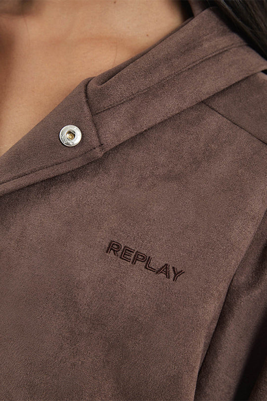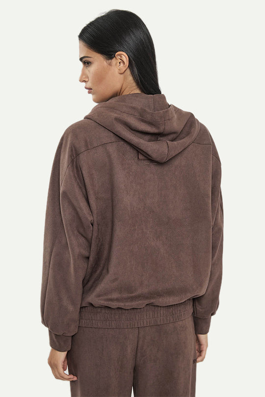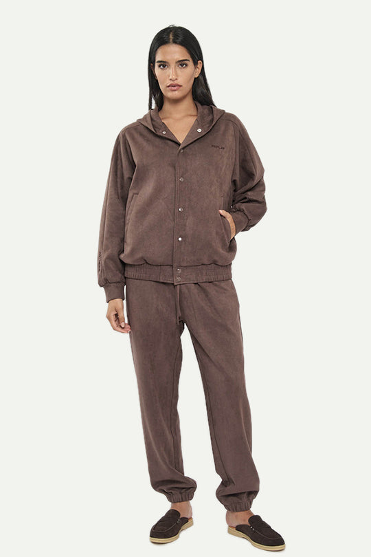 קפוצ׳ון לנשים מבד דמוי זמש רך ונעים בגזרה נינוחה. סגירה קדמית בכפתורי תיק־תק, כובע נוח, כיסים צדדיים וסיומות ריב בשרוולים ובפס התחתון להתאמה יציבה. לוגו קטן בחזה מוסיף טאץ׳ ממותג. צבע חום חמים שמתאים לשכבות יומיומיות עם מכנסי טרנינג תואמים או ג׳ינס ללוק חורפי נקי ומעודכן.
