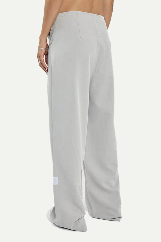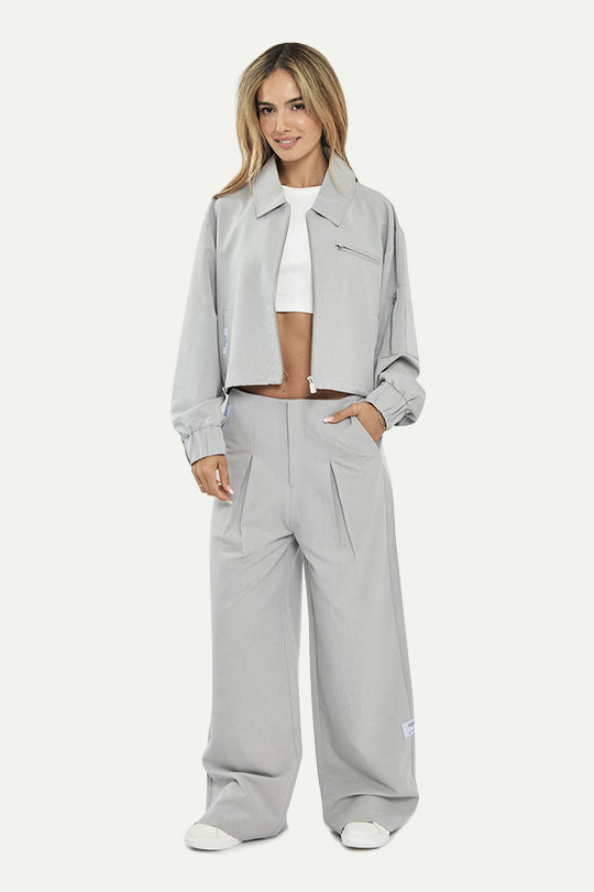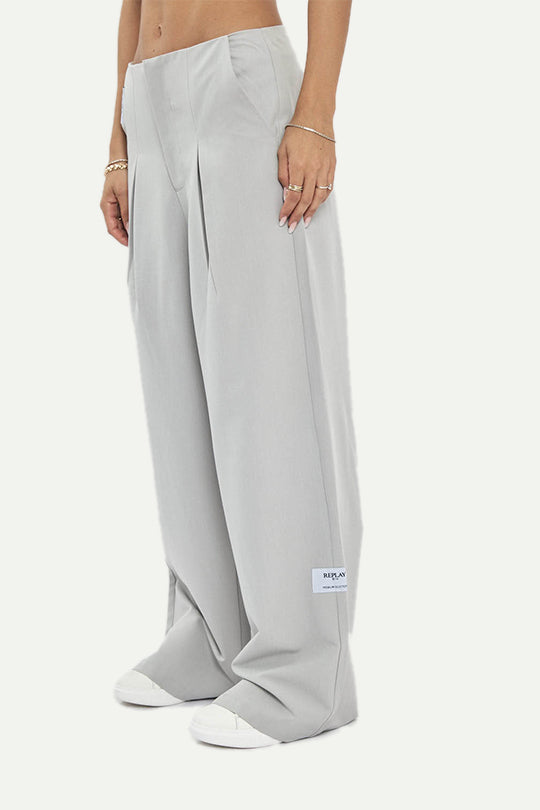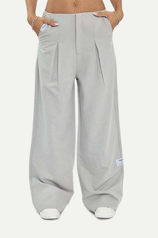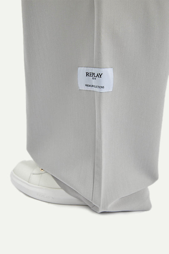מכנסי טיילורד בגזרה רחבה עם קפלים קדמיים לנפילה מחמיאה. מגיעים באפור בהיר עם סגירה קדמית נקייה ותווית לוגו קטנה. בד יציב שיושב יפה על הגוף. מתאימים כסט עם ג’קט תואם או כלוק עצמאי יומיומי ומסודר.