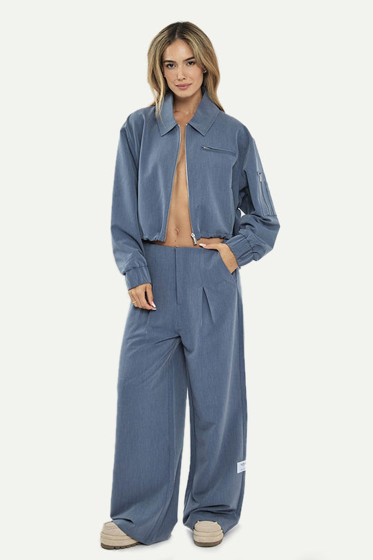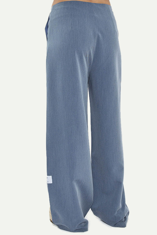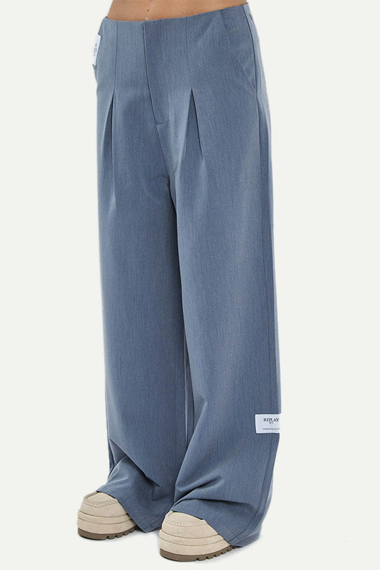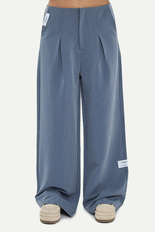 מכנסי טיילורד בגזרה רחבה עם קפלים קדמיים ליצירת נפילה מחמיאה. מגיעים בצבע כחול עם סגירה קדמית נקייה ותווית לוגו קטנה. בד יציב שמייצר מראה מלוטש. משתלב כסט עם הג’קט התואם או כפריט עצמאי ללוק יומיומי מדויק.