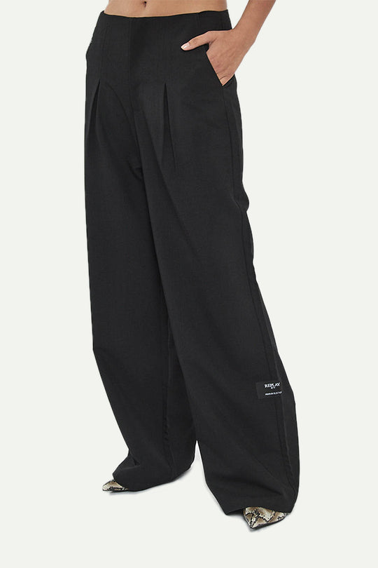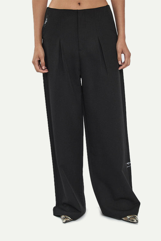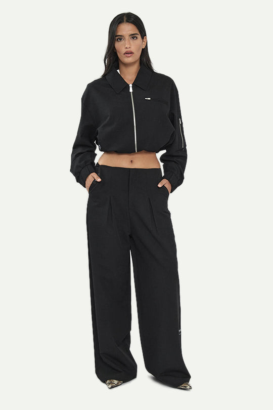 מכנסי טיילורד בגזרה רחבה עם קפלים קדמיים ליצירת נפילה מחמיאה. מגיעים בצבע שחור עם סגירה קדמית נקייה ותווית לוגו קטנה. בד יציב שמייצר מראה מלוטש. משתלב כסט עם הג’קט התואם או כפריט עצמאי ללוק יומיומי מדויק.