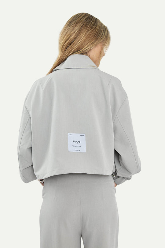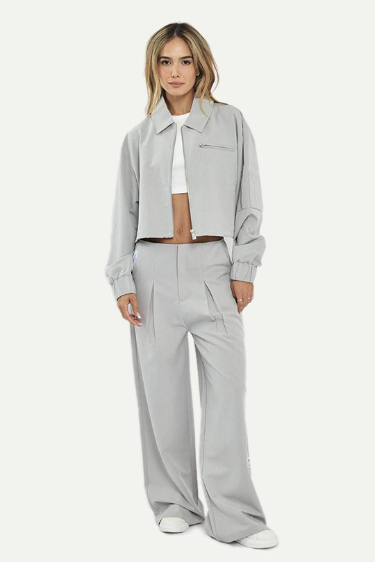 ג’קט בגזרת טיילורד עם מראה נקי ומדויק. מגיע בצבע אפור בהיר עם רוכסן קדמי, כיסי רוכסן מעוצבים וגזרת קרופ שמייצרת לוק חד. משתלב מעולה עם מכנס תואם או מעל טופ בסיסי לסטייל יומיומי.