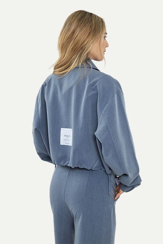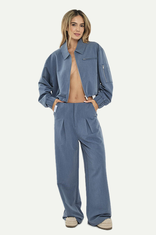 ג’קט בגזרת טיילורד עם מראה נקי ומדויק. מגיע בצבע כחול עם רוכסן קדמי, כיסי רוכסן מעוצבים וגזרת קרופ שמייצרת לוק חד. משתלב מעולה עם מכנס תואם או מעל טופ בסיסי לסטייל יומיומי.