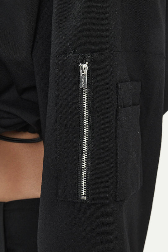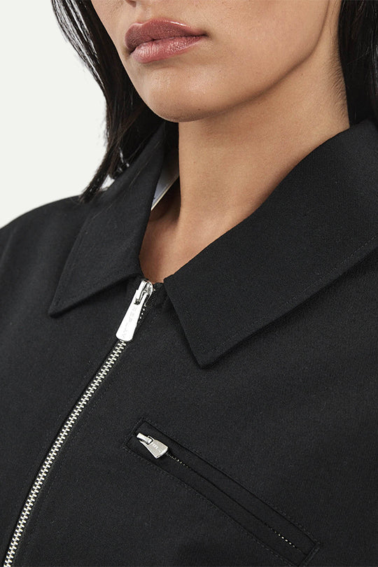 ג’קט בגזרת טיילורד עם מראה נקי ומדויק. מגיע בצבע שחור עם רוכסן קדמי, כיסי רוכסן מעוצבים וגזרת קרופ שמייצרת לוק חד. משתלב מעולה עם מכנס תואם או מעל טופ בסיסי לסטייל יומיומי.