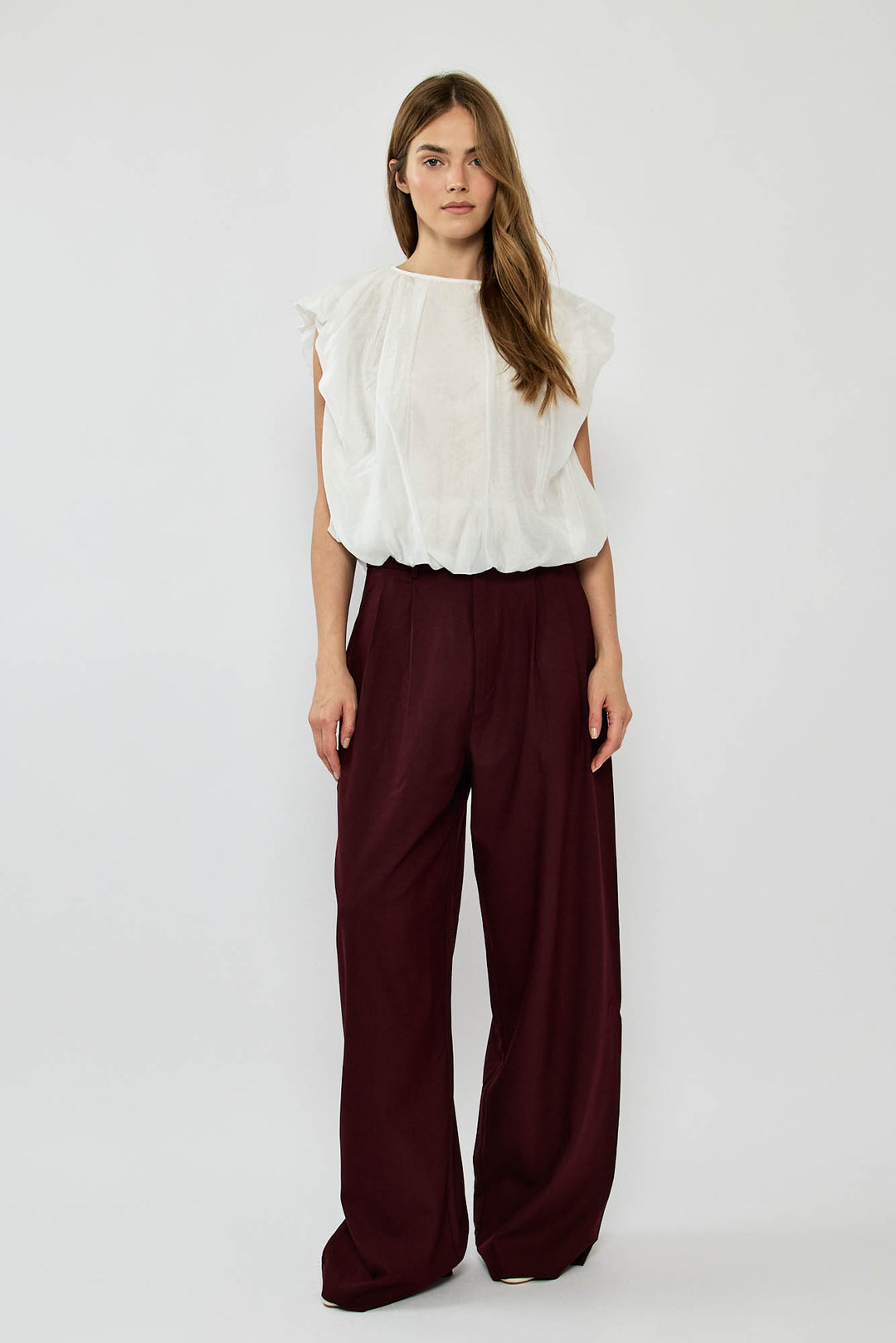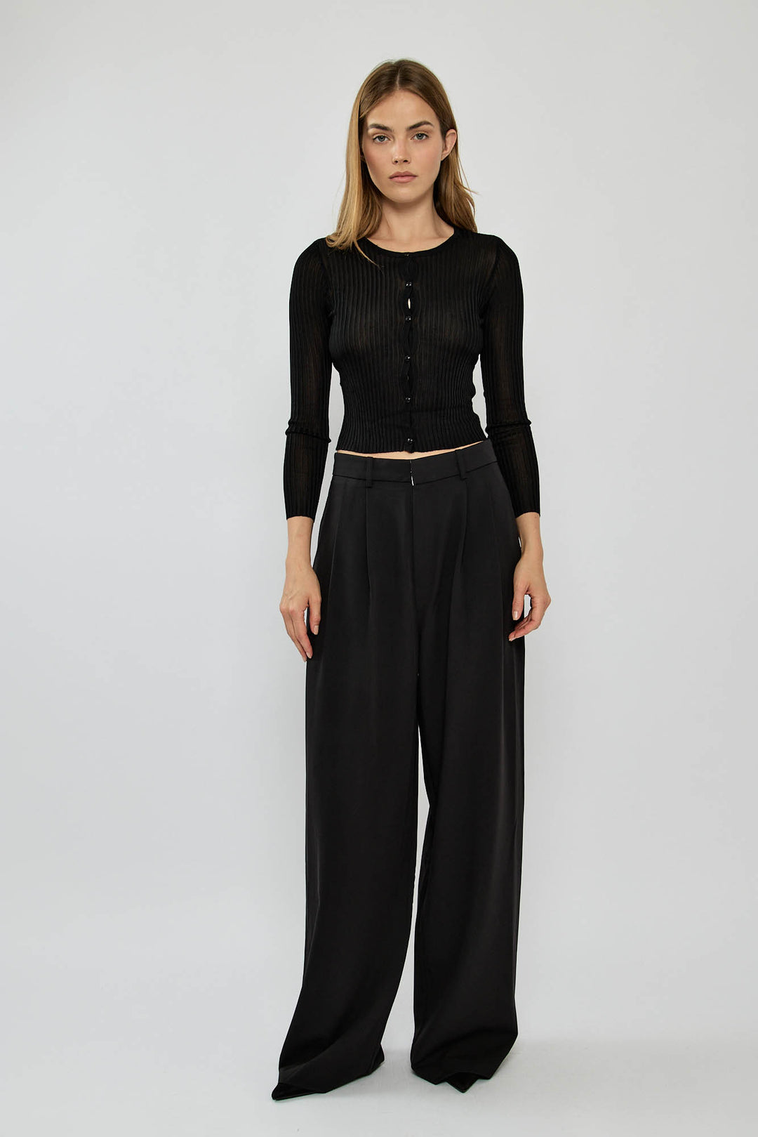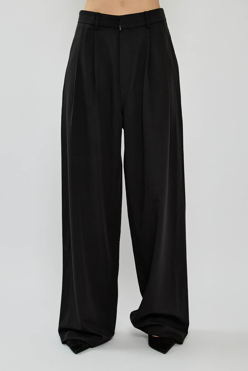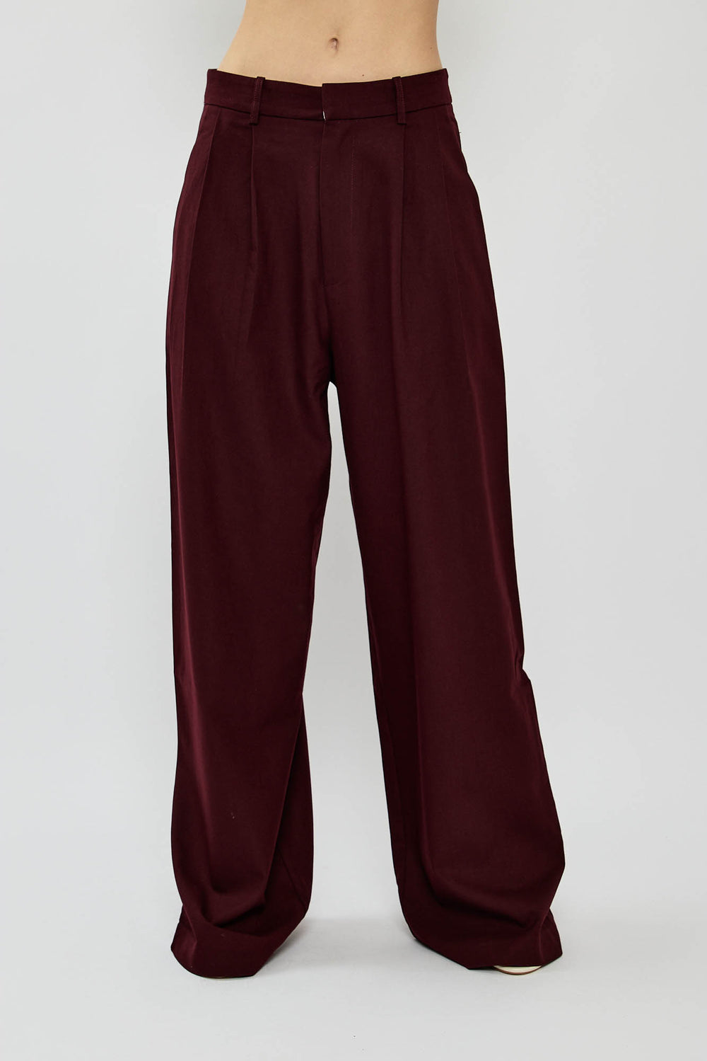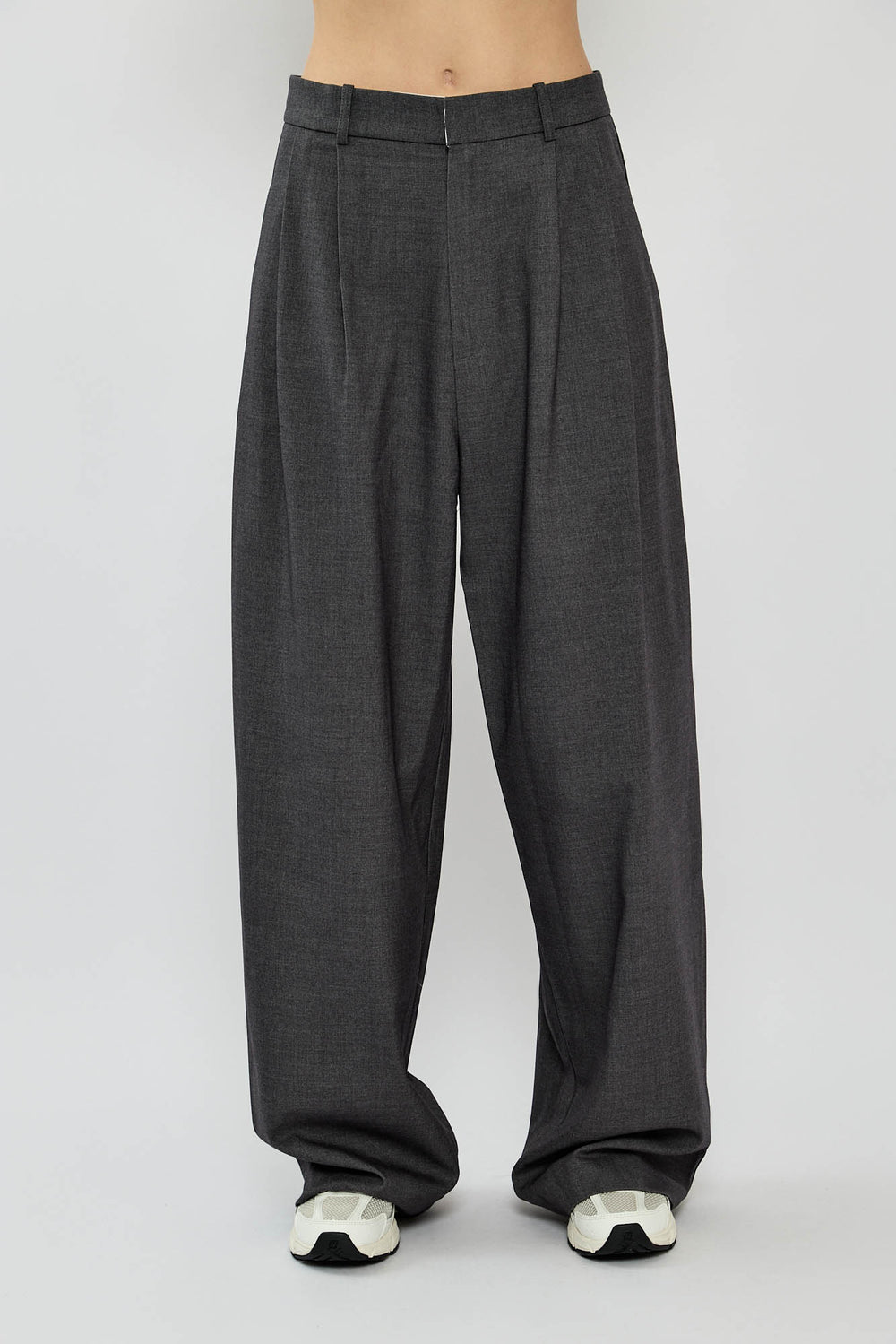 מכנסיים אלגנטיים בצבע אפור עם גזרה רחבה ומשוחררת, קפלים קדמיים וכיסי צד נוחים. סגירת רוכסן וכפתור בחזית להשלמת המראה המחויט. פריט ורסטילי שמתאים גם ליום יומי וגם לערב.