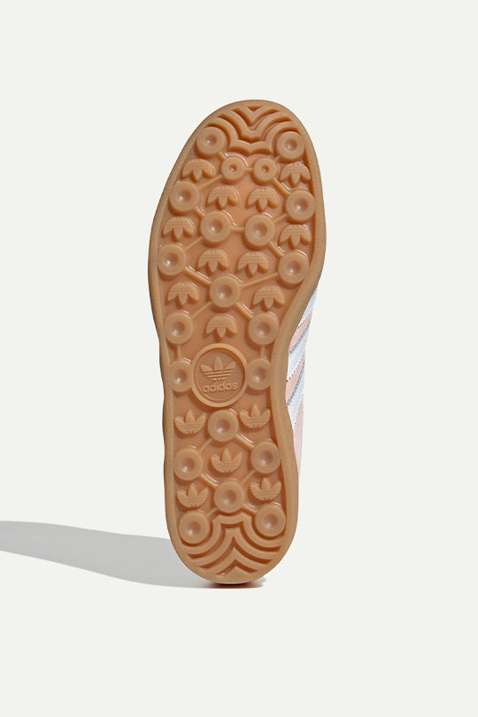 נעלי GAZELLE INDOOR בגוון ורוד חול עם שלושת הפסים בכחול בהיר. עשויות זמש רך עם סוליית מסטיק שקופה שנותנת לוק רטרו נקי. לוגו מוזהב בצד משלים את המראה. פריט יומיומי עם סטייל עדין ומדויק.