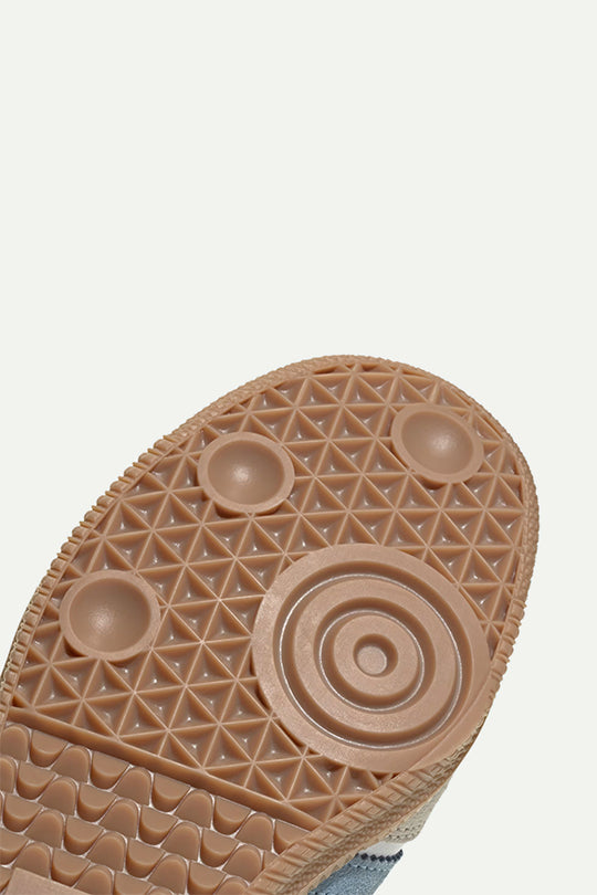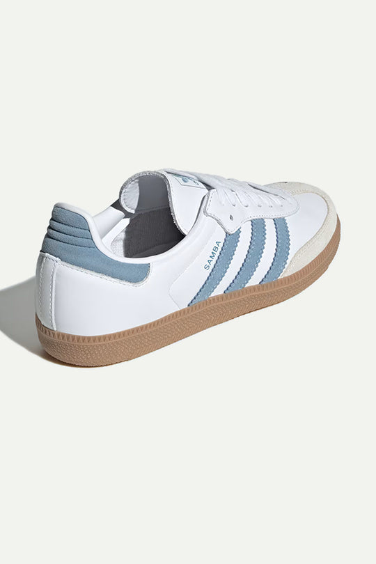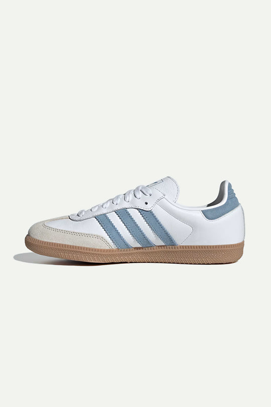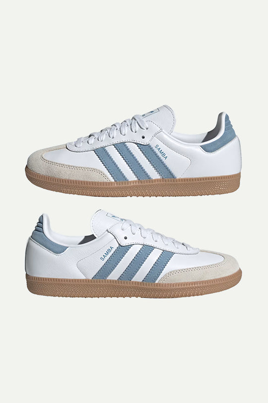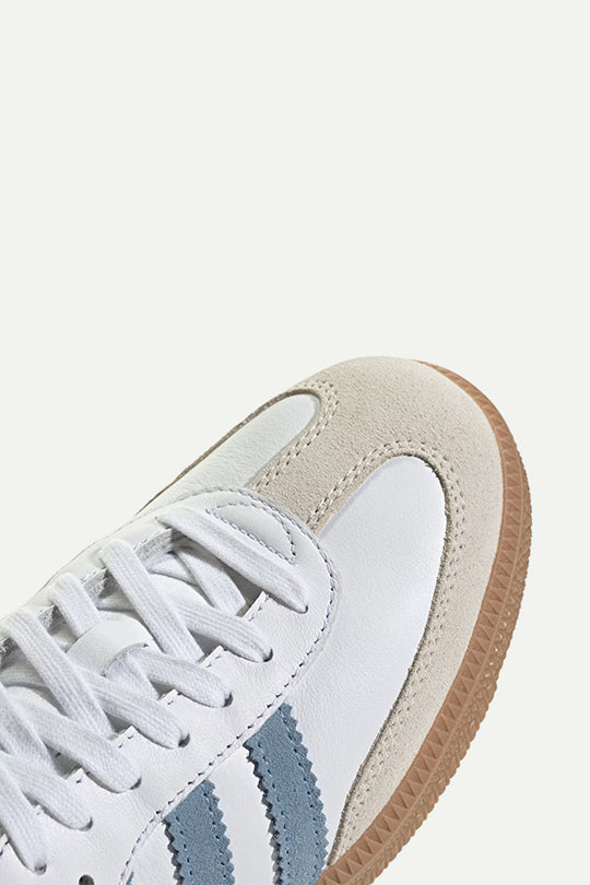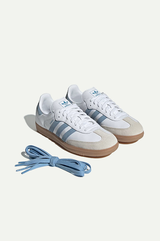 נעלי סניקרס אייקוניות של אדידס עם שילוב עור לבן ופסים תכולים בצד. סוליית גומי בגוון טבעי משלימה את המראה הקלאסי. פריט על-זמני שמעניק לכל לוק טאץ’ ספורטיבי ואופנתי.