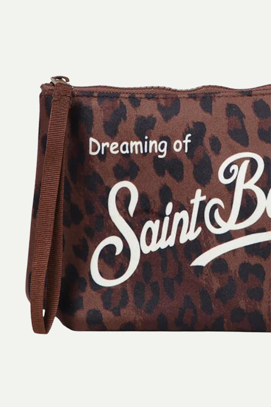 תיק קלאץ' בהדפס מנומר חום כהה עם רקמת Saint Barth בלבן.