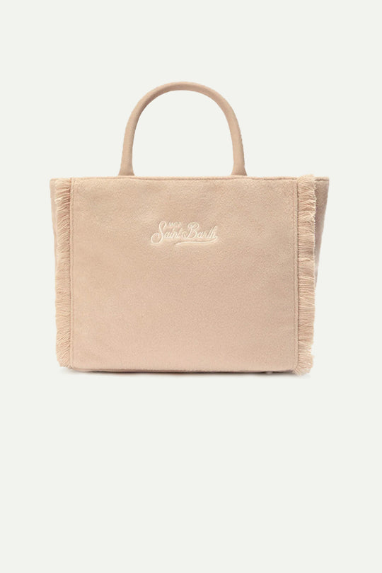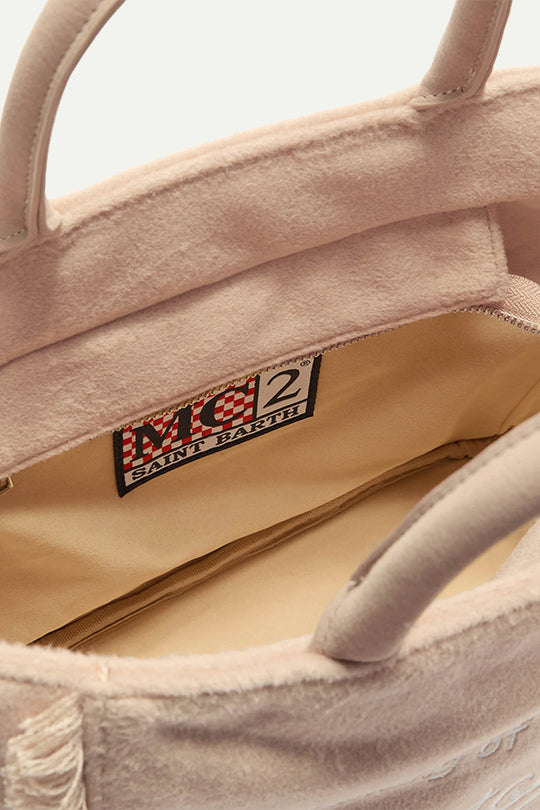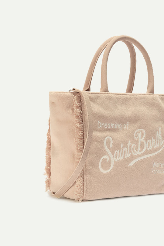 תיק רך ומפנק בעיצוב חורפי עם רקמת Saint Barth לבנה מלפנים.