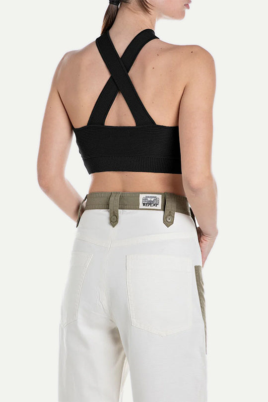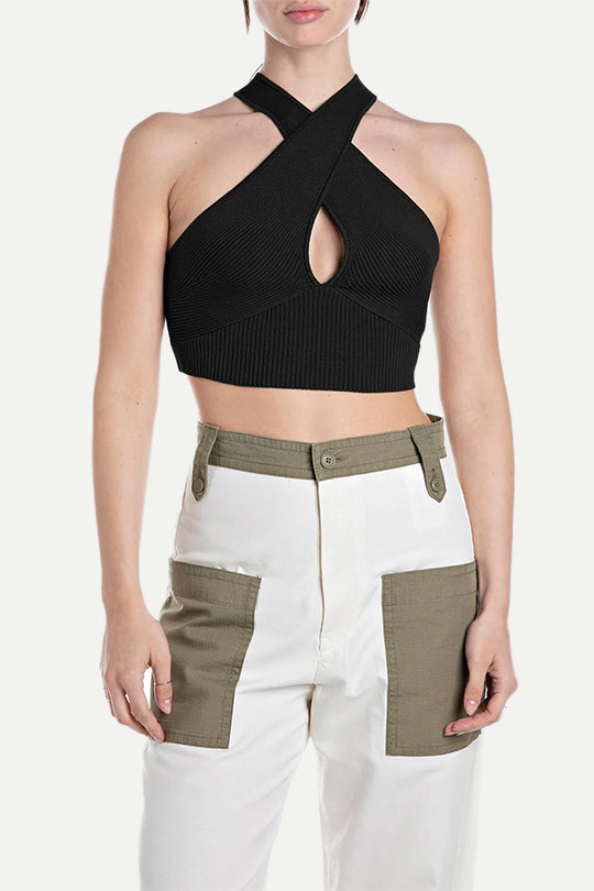 טופ קרופ מחמיא עם עיצוב ריב גמיש וצמוד לגוף, בגזרת קולר מוצלבת קדמית ופתח טיפה בחזית למראה נשי ועוצמתי. בד נעים ונושם, מושלם לשילוב עם מכנסיים גבוהים או חצאית. מתאים ליציאות וגם לערב קיץ נעים.