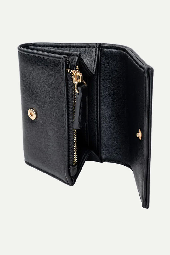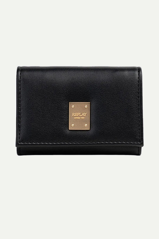 ארנק קטן ואלגנטי בגוון שחור, בעיצוב ריבועי מתקפל עם סגירה קדמית מינימליסטית. לוגו מתכתי של Replay במרכז מעניק טאץ' יוקרתי, בעוד הפנים כולל תאים חכמים לכרטיסים, שטרות ומטבעות. אידיאלי לנשיאה יומיומית או לתיק קטן – פרקטי, מסוגנן ומדויק.