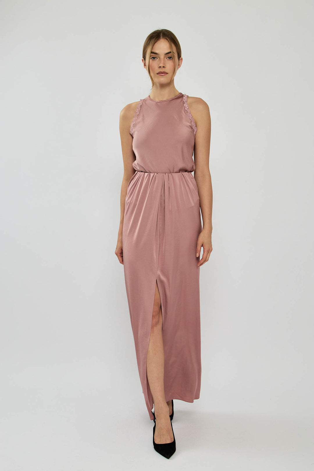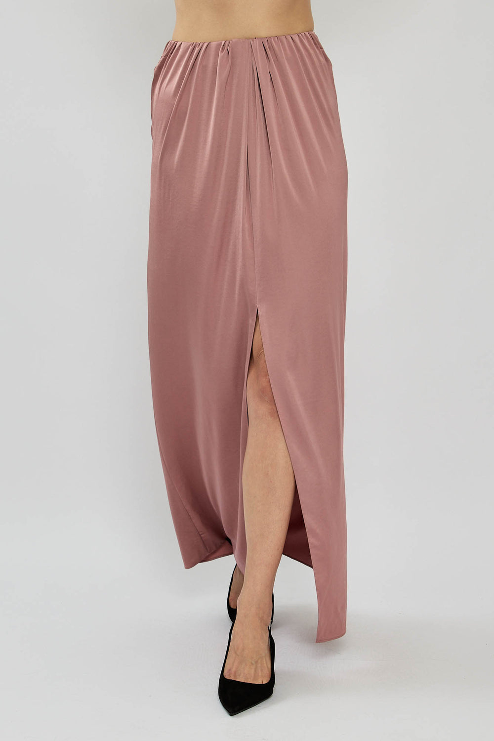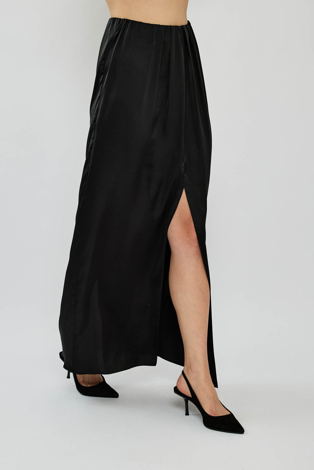 חצאית מקסי אלגנטית מבד מבריק ונשפך. בעלת גזרה גבוהה עם שסע קדמי שמוסיף טאץ' סקסי וקליל. מתאימה לאירוע ערב עם עקבים או ללוק יומיומי עם סניקרס.