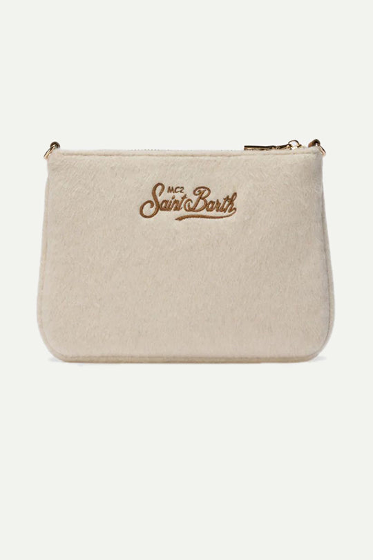 תיק צד קטן בעיצוב רך עם רקמת Saint Barth מלפנים.