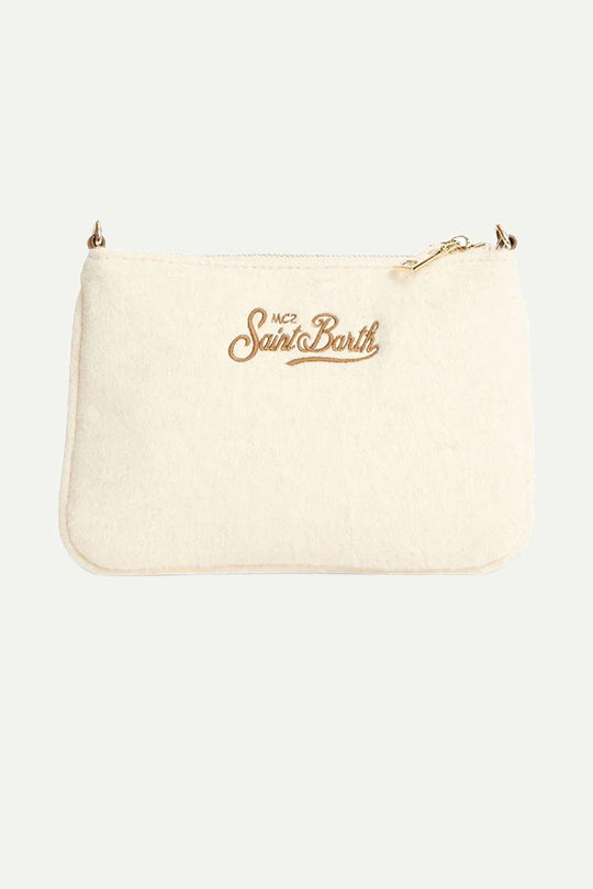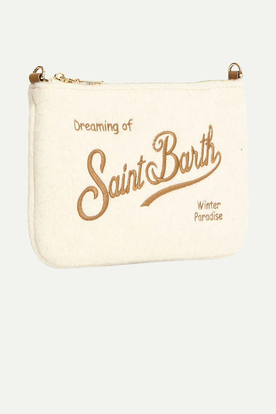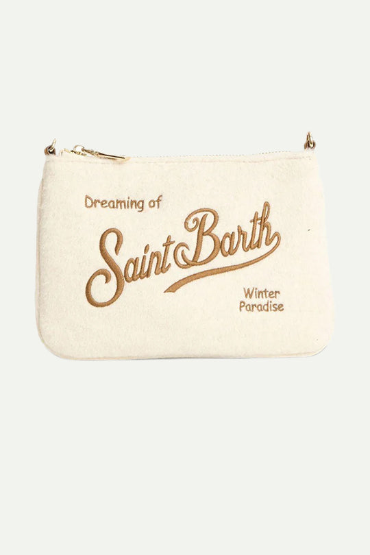 תיק קלאץ' בצבע שמנת עם רקמת Saint Barth חומה. עשוי בד רך במראה חורפי, עם סגירת רוכסן עליונה ואפשרות לחיבור רצועה. אידיאלי לנשיאה יומיומית או כתיק ערב קליל.