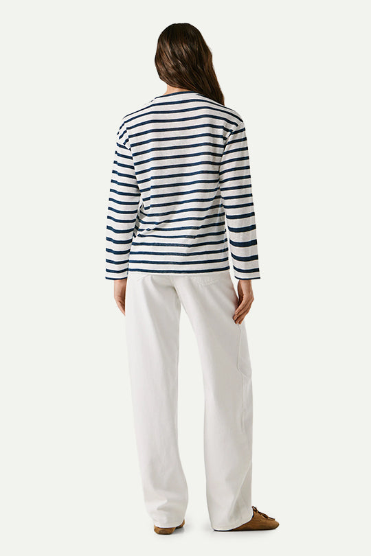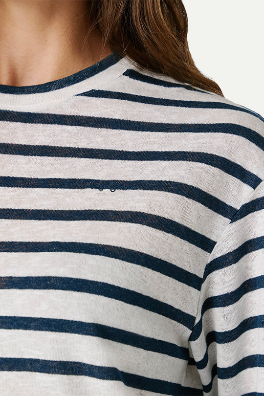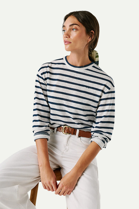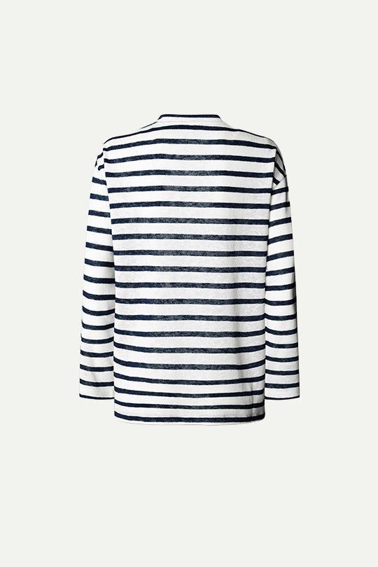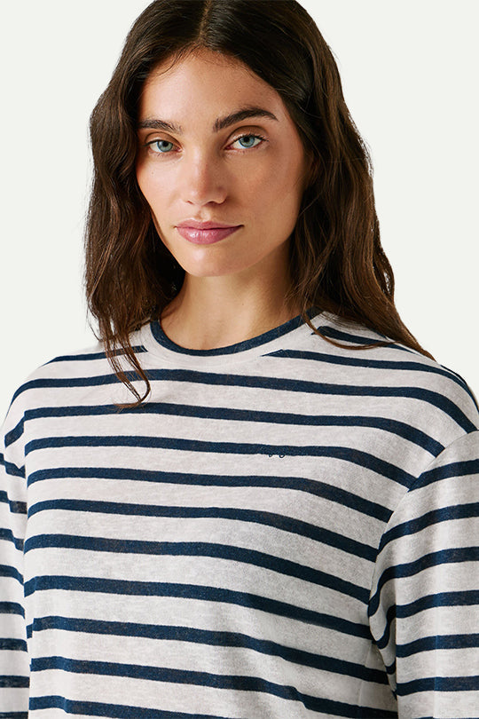 טי-שירט לנשים בעיצוב קלאסי עם פסים אופקיים בצבע כחול ולבן, עשויה בד כותנה רך ונעים למגע. החולצה בגזרה נינוחה עם שרוולים ארוכים וצווארון עגול, ומתאימה ללוק יומיומי קליל ונוח. משתלבת בקלות עם ג'ינס או מכנסיים בהירים ליצירת מראה נקי ועל-זמני.