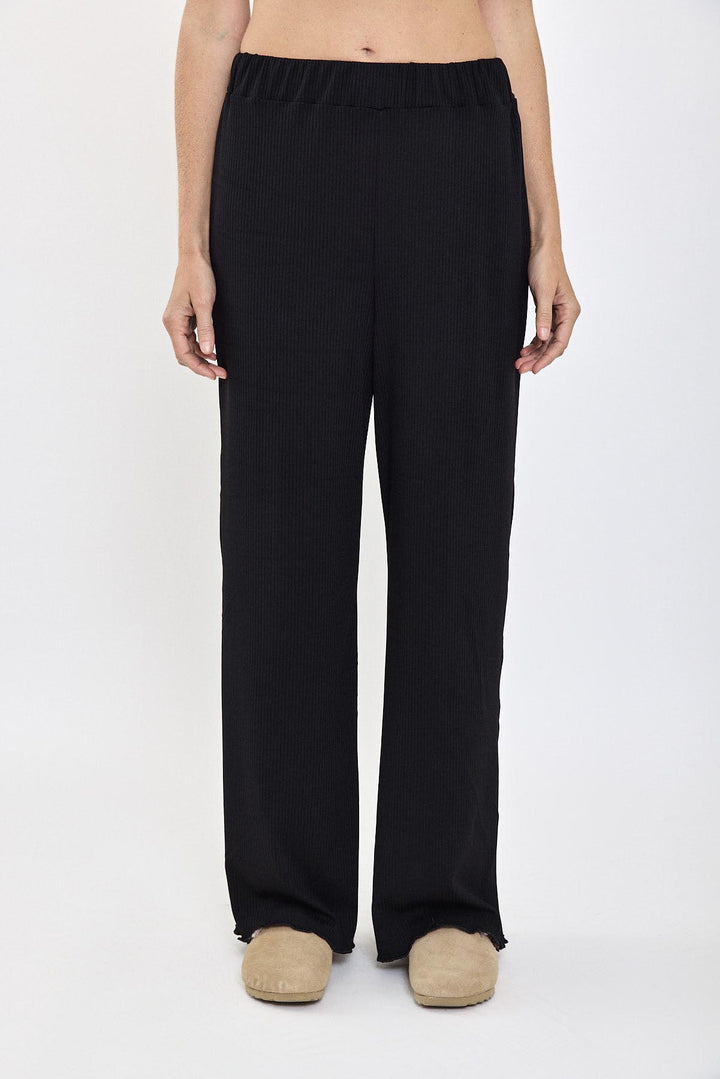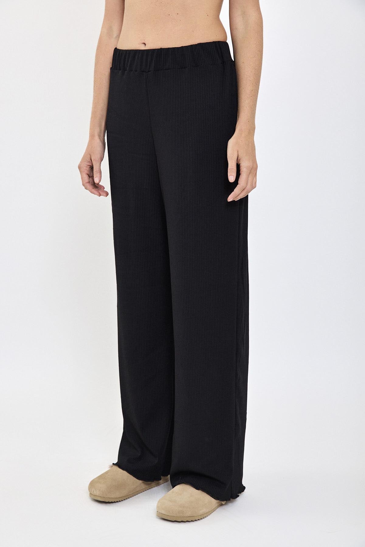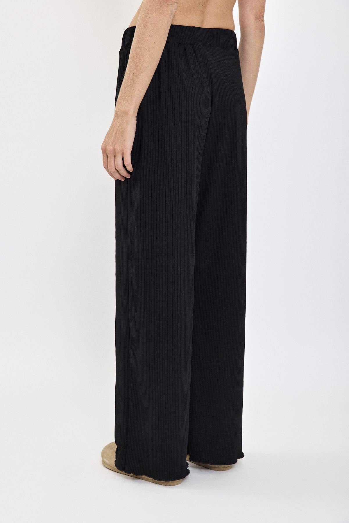 מכנסי GINGER מבית Razili Studio בגוון שחור קלאסי. מכנסיים רחבים ונוחים עם בד ריב רך ונעים, מושלמים למראה קז'ואלי ואלגנטי. מתאימים לשילובים יומיומיים ומעניקים תחושת נוחות עם נגיעה של סטייל.