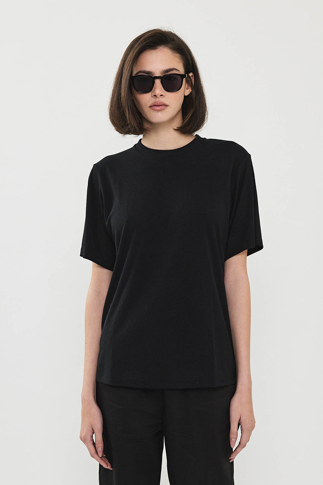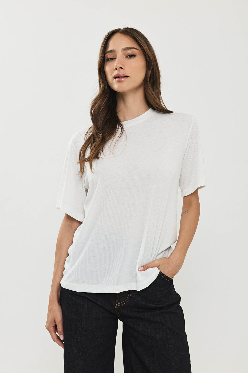חולצת טי מבד ריב רך ונעים של RAZILI STUDIO, בגזרה משוחררת בצבע לבן קלאסי שמתאים לכל לוק. הבד האלסטי עם הטקסטורה העדינה מחמיא לגוף ומאפשר נוחות מרבית לאורך כל היום. מתאימה לשילוב עם ג'ינס, חצאית או שכבות – מושלמת ליום-יום ולעונות מעבר.