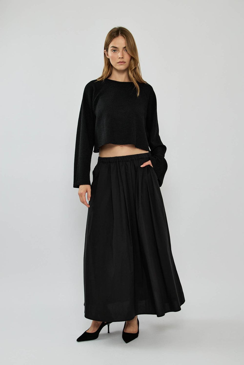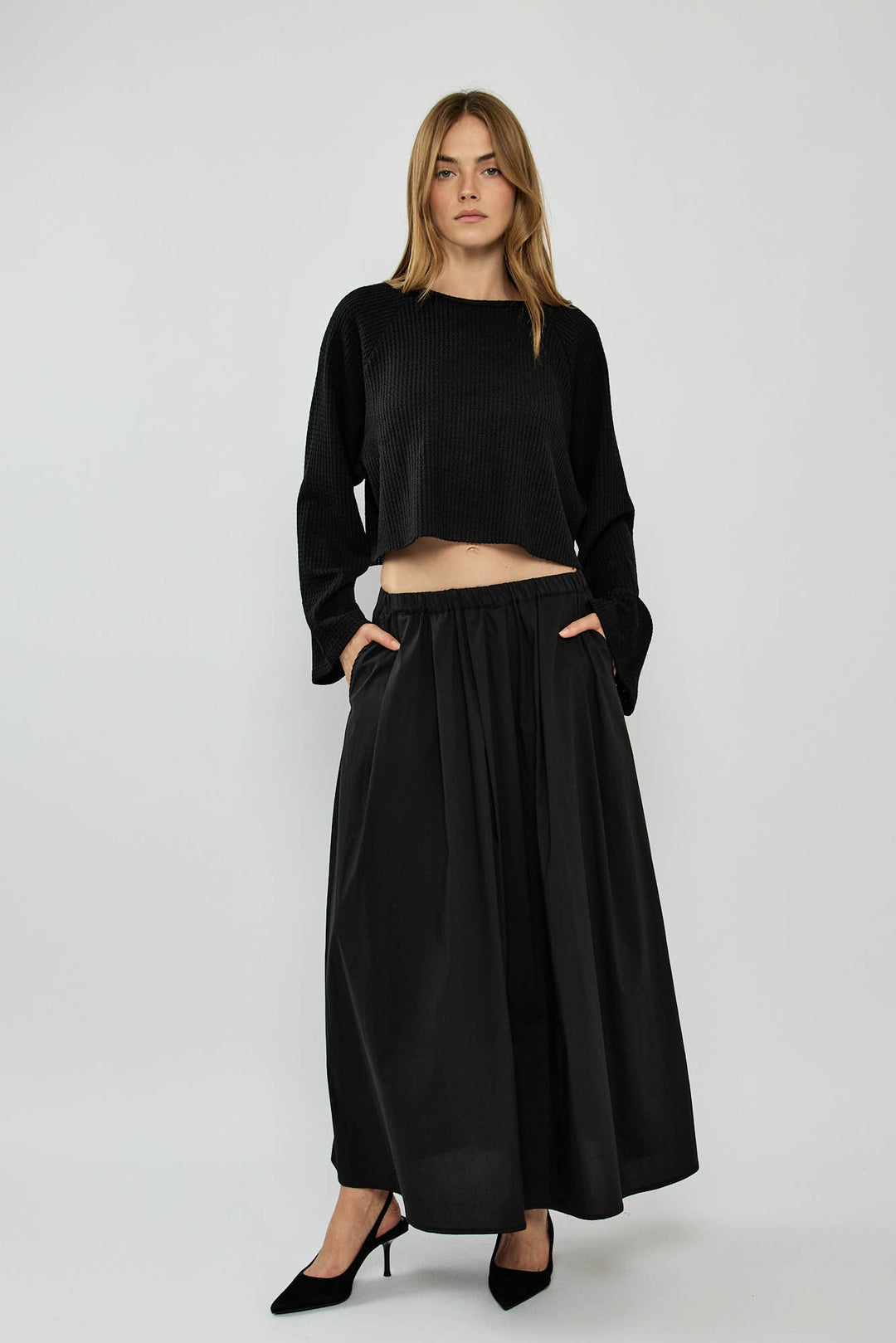 חצאית בגזרת מידי מתרחבת, עם גומי במותן לנוחות וכיסים צדיים פרקטיים. מתאימה לשילוב יומיומי או ערב עם טאץ' אלגנטי.