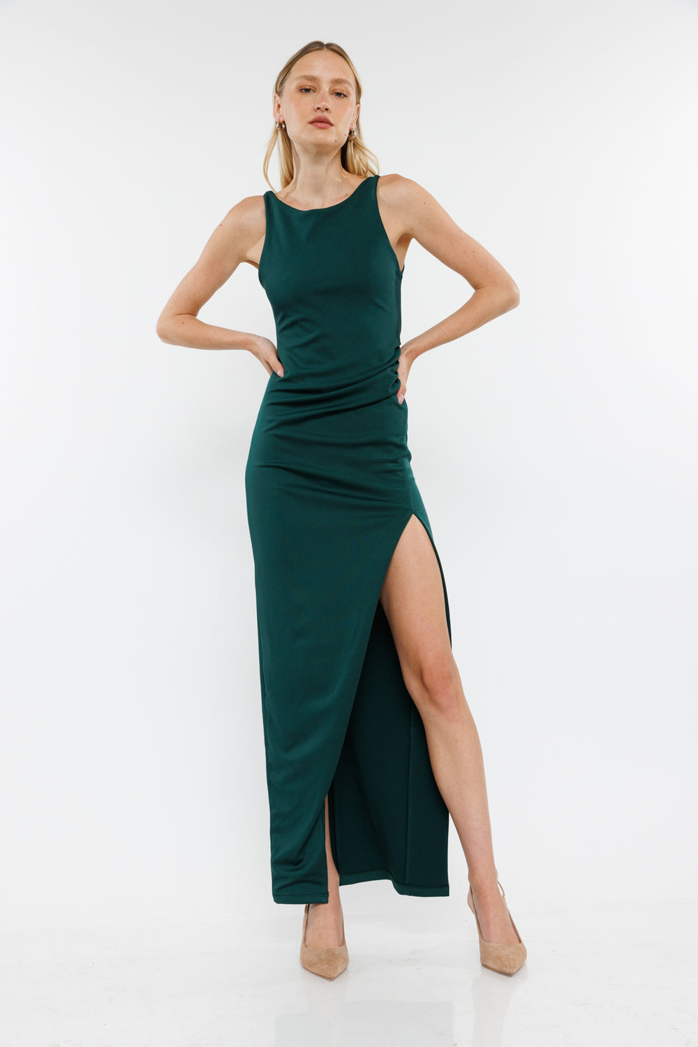 שמלת מקסי היסטרית בעיצובה של נטע אפרתי הידועה בעיצובי הערב המרשימים שלה. לשמלה גזרה צמודה לגוף עם שסע עמוק לאורך הירך ומפתח צוואר כמעט בצורת סירה. מדובר בשמלה מחמיאה ומחטבת עם מחשוף עגול בגב. השלימי את הלוק עם תיק ערב קטן וסנדלי עקב.