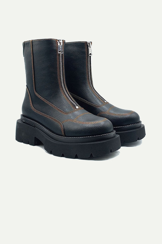 מגפי נשים מדגם ORPHEA בעיצוב אורבני ונועז בצבע שחור, עם תפרים חומים דקורטיביים להדגשת המבנה. עשויים דמוי עור איכותי עם רוכסן קדמי לנעילה נוחה ומהירה. סוליית טרקטור עבה מעניקה מראה בולט ונוחות מירבית גם בימים ארוכים. מתאימים לשילוב עם לוק אלגנטי־אורבני או יומיומי חורפי.