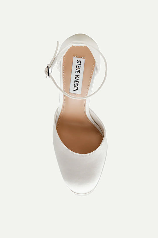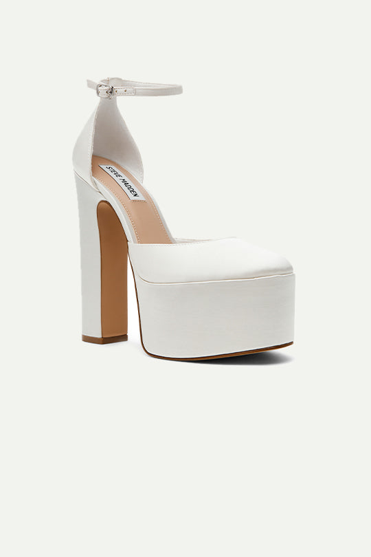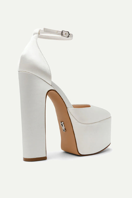 נעלי עקב דרמטיות עם פלטפורמה גבוהה ורצועת קרסול עדינה. עשויות סאטן לבן בגימור חלק ונשי. מראה עוצמתי שמרים כל אאוטפיט לערב או לאירוע.