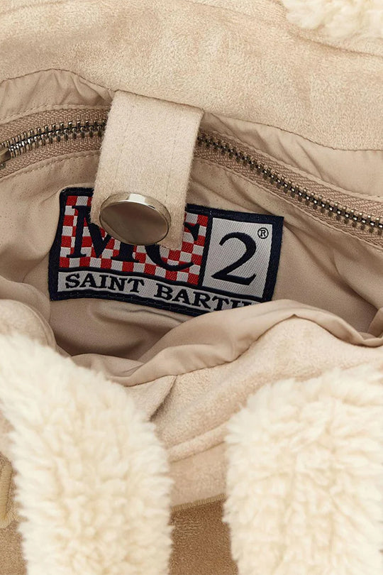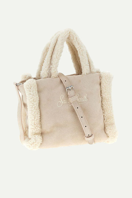 תיק בעיצוב חמים עם גימורי פרווה נעימים ורקמת Saint Barth לבנה בחזית.
