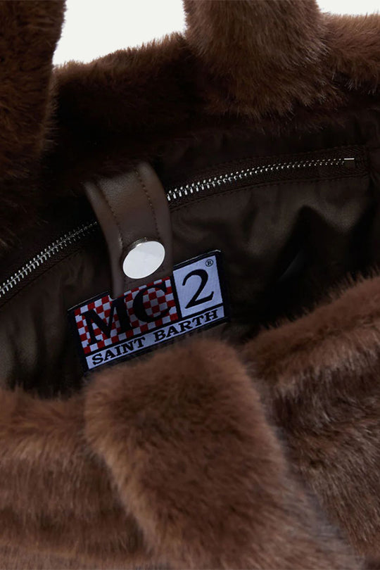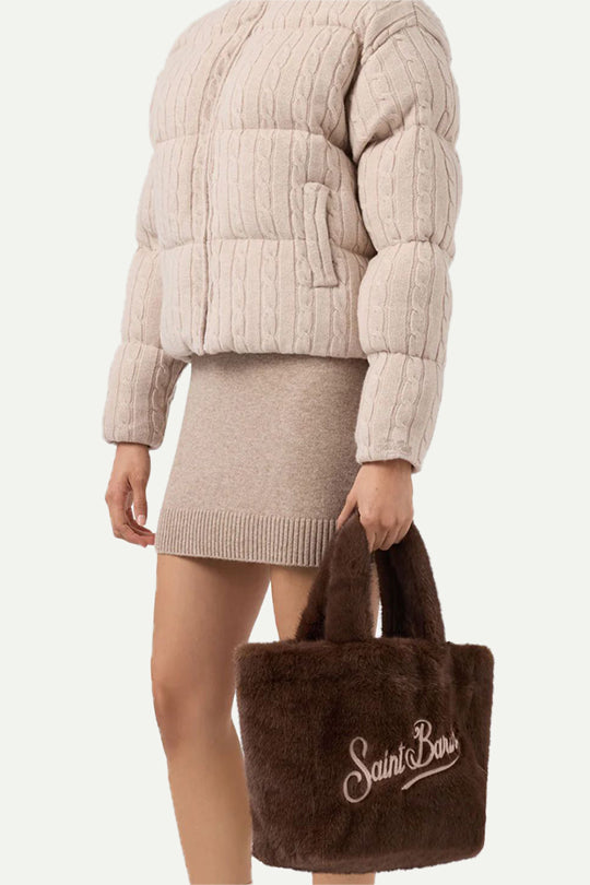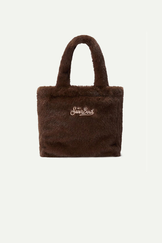 תיק קטן ורך עם מראה פרווה חורפי וכיתוב Saint Barth רקום מלפנים.