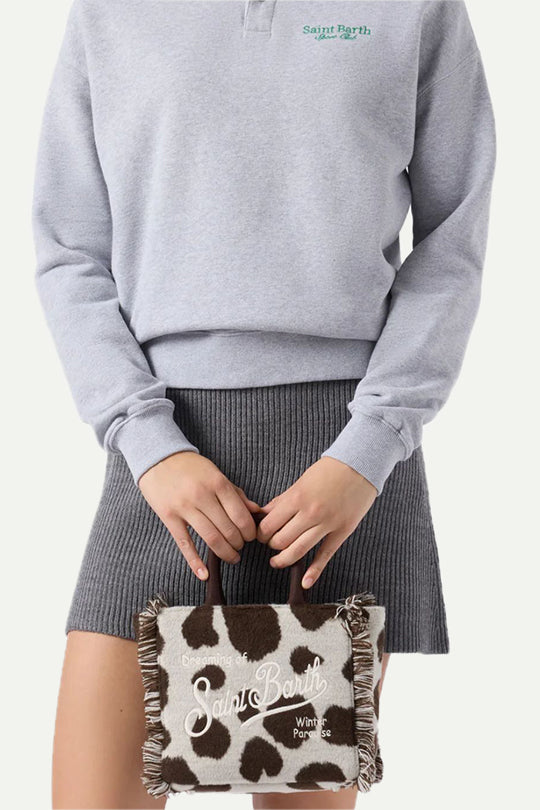 תיק קטן עם הדפס פרה ושוליים עם פרנזים.